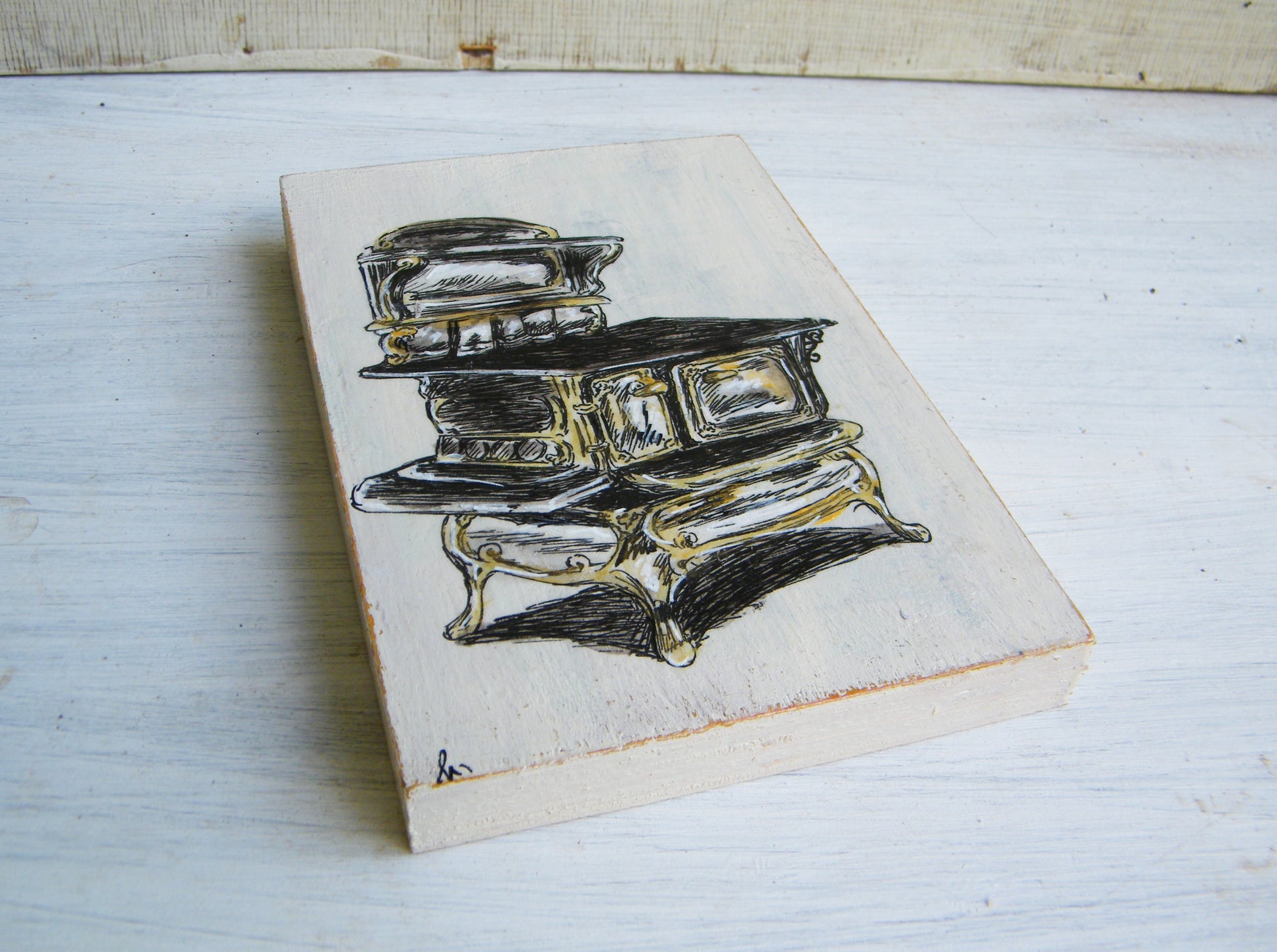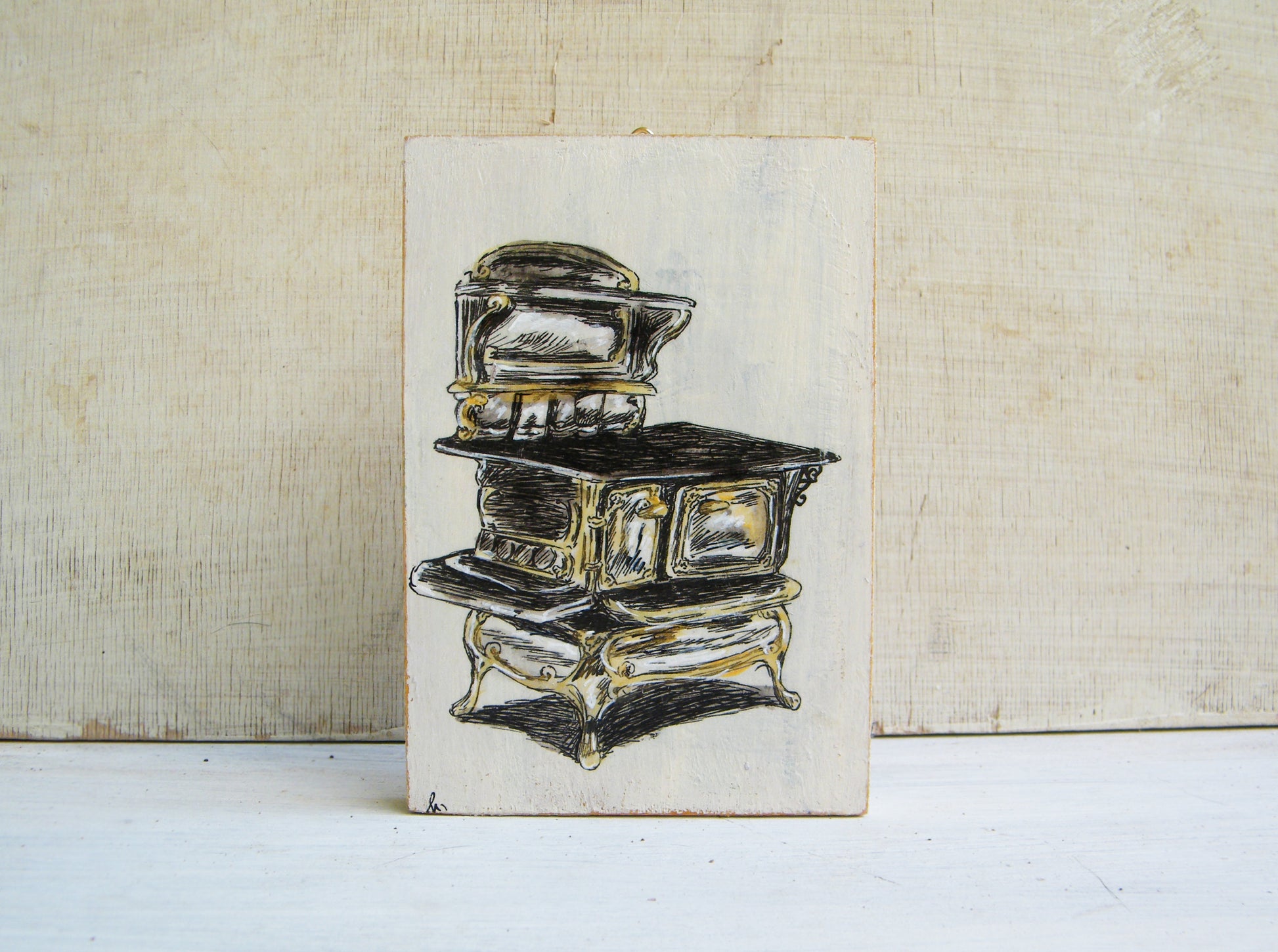תמונה קטנה מעץ עם איור תנור ברזל עתיק בסגנון רטרו.
