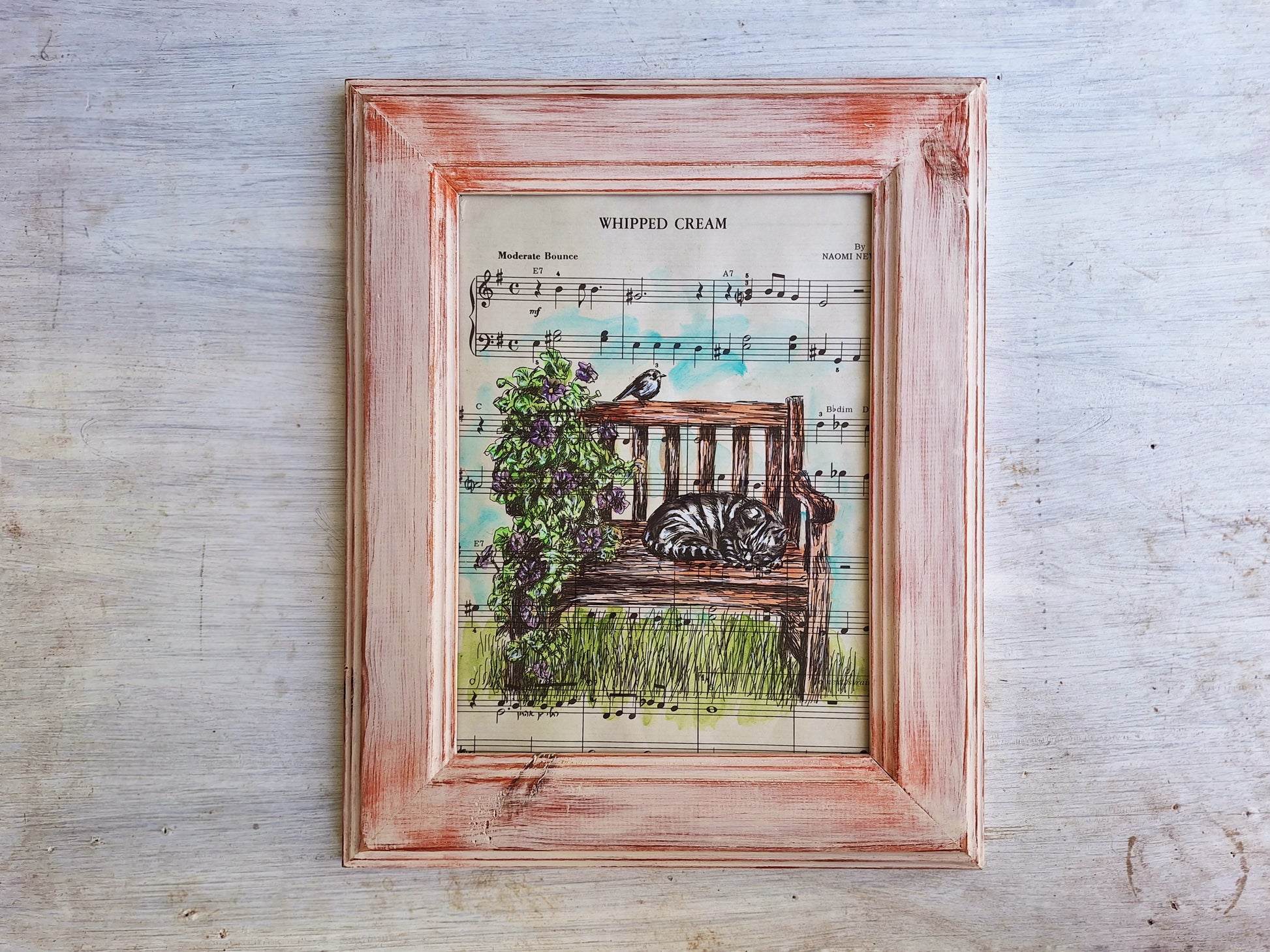 תמונה ממוסגרת מקסימה עם הדפס מרגיע של חתול מנמנם על ספסל ישן.